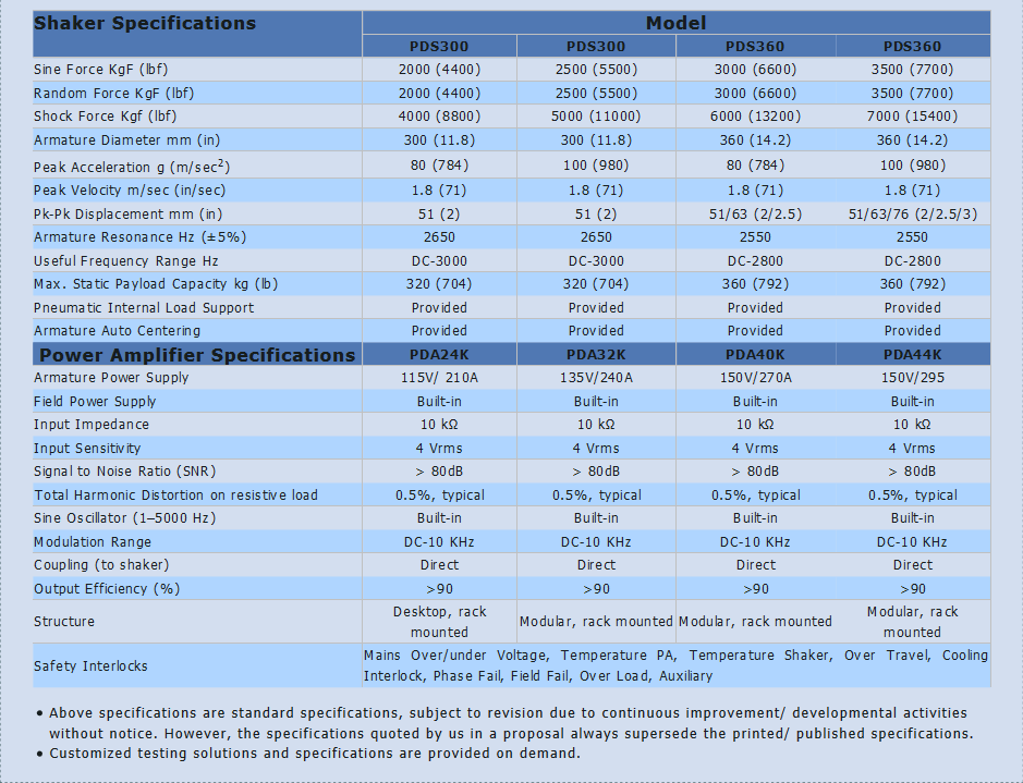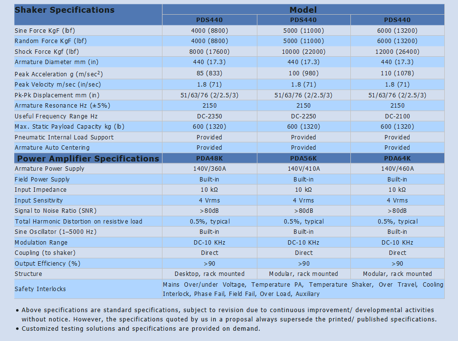 The Electrodynamic shaker system is intended to simulate the effects of real life vibrations likely to be experienced by components, sub-assembly and systems during their service life when they are installed in an environment where vibrations are continuously induced during usage. These shakers perform vibration test in accordance with IS, BS, MIL, DIN, EN, ISO, IEC, DEF & ASTM standards. Pacific Dynamics offers a choice of capacity and payloads to suit different test requirements. Customized attachments for mounting of test objects are also available for different applications which are possible because of our technical know-how and experience to design and manufacture high quality products. The Electrodynamic shaker systems have proven versatility in vibration testing applications because of having unique feature of higher resonance frequency and high bare table acceleration with required accuracy and reliability. They are designed to cater wide range of vibration testing and analysis such as design qualification, product reliability and environmental stress screening.The System has major sub systems like Shakers, Power Amplifiers, Shaker Attachments and Vibration Controllers.